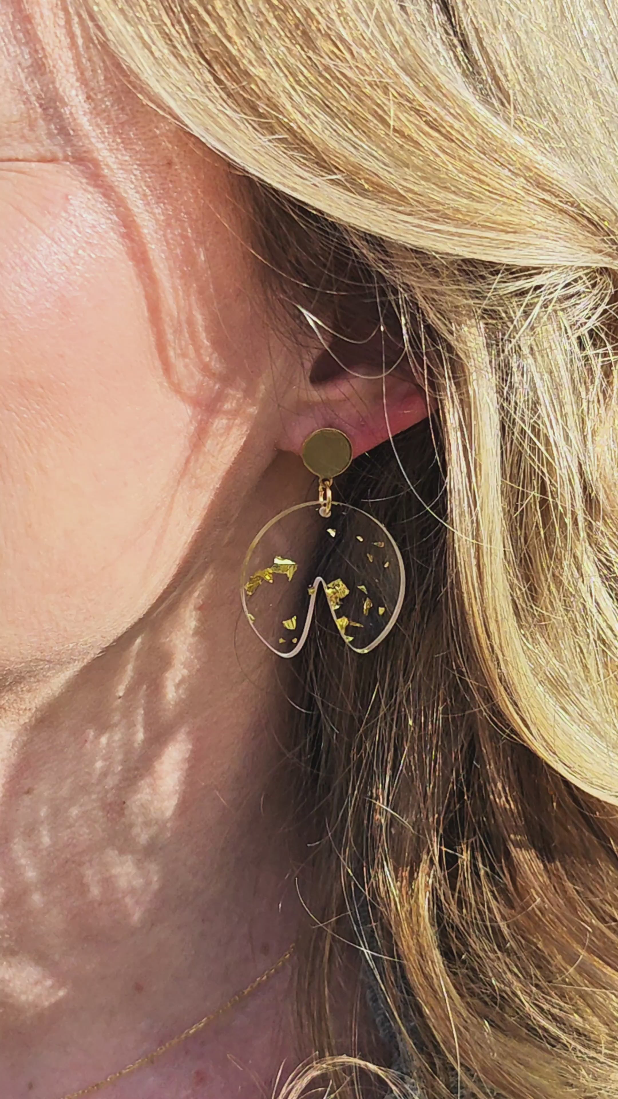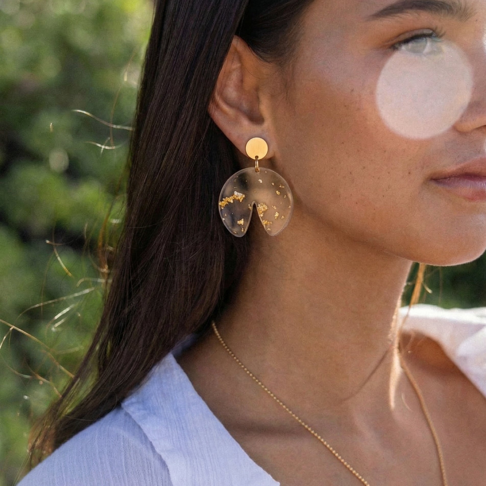 Transparentes Greencast Acryl trifft auf echtes Blattgold. In Handarbeit gefertigt – jedes Stück ein Unikat. Getragen mit einem goldenen Stecker, leicht genug für jeden Tag, besonders genug für den Abend.