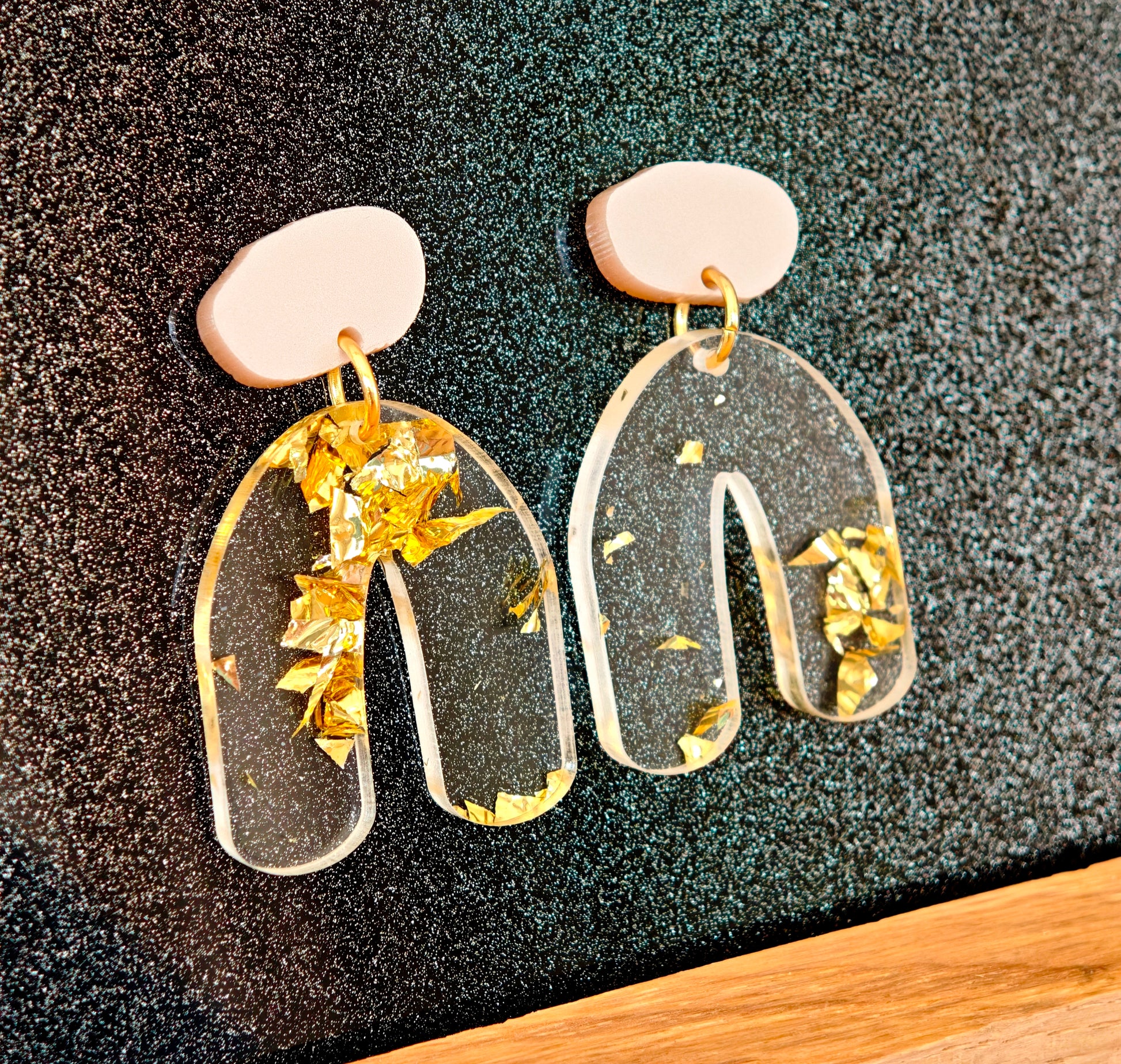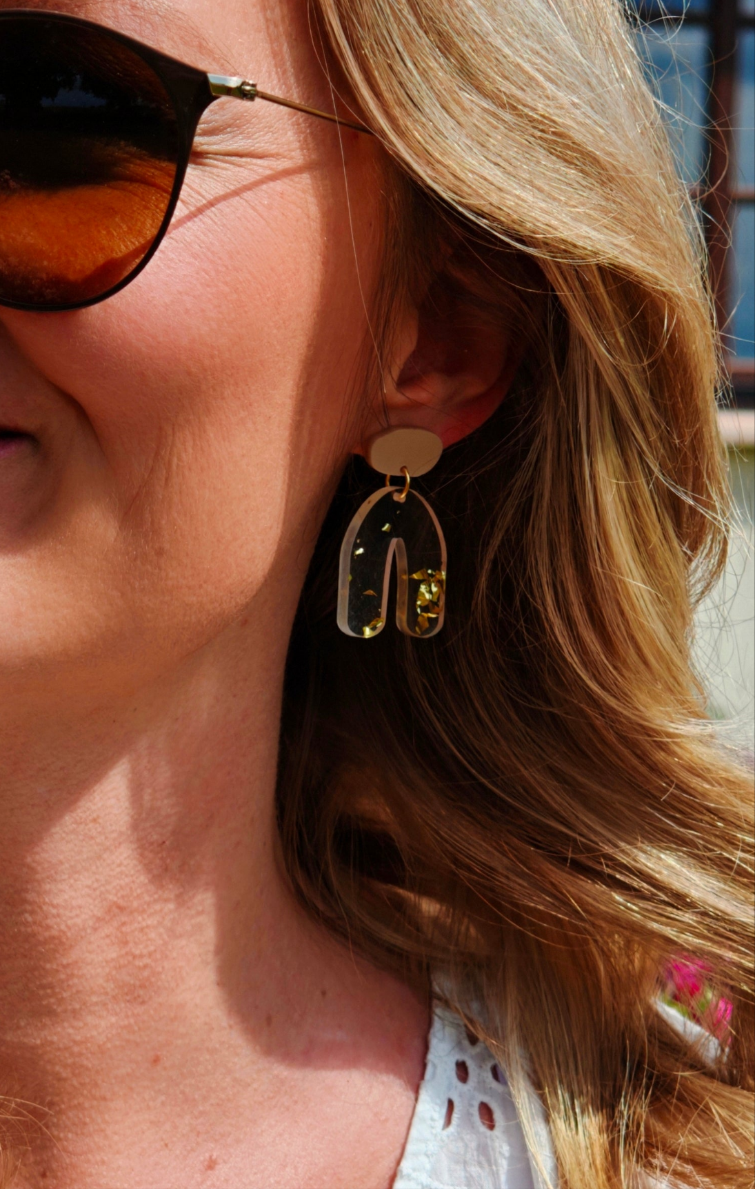 Die charaktervolle Form erinnert an ein zartes Hufeisen oder einen schwungvollen Bogen und symbolisiert Glück, Bewegung und Lebendigkeit. In klarem, recyceltem Acryl fangen schwebende Partikel aus goldenem und silbernem Blattgold das Licht ein und verleihen jedem Ohrring einen einzigartigen Glanz.